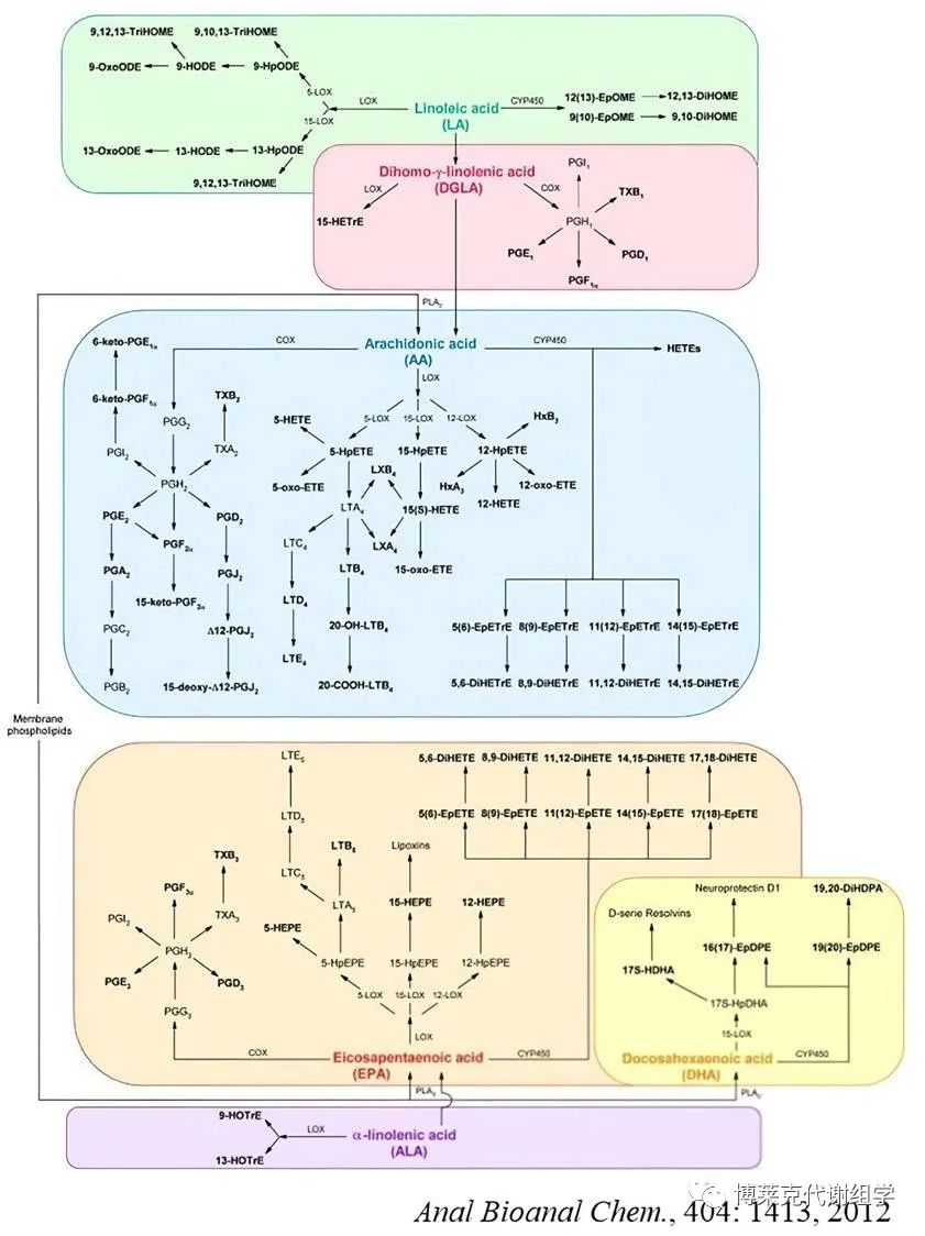 類花生酸(Arachidonic acid (AA)-derived eicosanoids),又稱為氧化脂質(zhì)(oxylipins)是多不飽和脂肪酸(花生四烯酸、亞油酸、α-亞麻酸、DHA、EPA等)發(fā)生自動(dòng)氧化或者是在特定酶(COX、LOX、CYP450)的作用下生成的一系列氧化代謝產(chǎn)物。