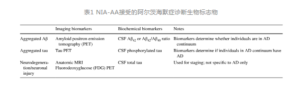 其中,NIA-AA標(biāo)準(zhǔn)承認(rèn)使用生物標(biāo)志物作為診斷手段的潛力,該標(biāo)準(zhǔn)認(rèn)可的阿爾茨海默癥診斷生物標(biāo)志物包括成像和生化生物標(biāo)志物,可分為三類:聚集的β-淀粉樣蛋白(Aβ)、聚集的tau(神經(jīng)纖維纏結(jié))以及神經(jīng)退行/神經(jīng)元損傷(表1)。