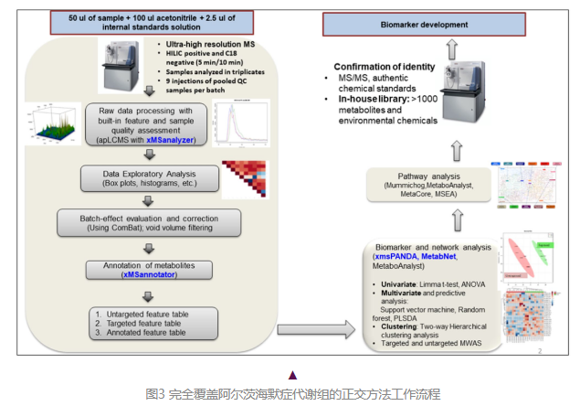 很顯然,患者的腦組織不是生物標(biāo)志物篩選的可行樣本來(lái)源;因此,早期研究使用死后的腦組織作為阿爾茨海默癥生物標(biāo)志物來(lái)源;現(xiàn)在,研究者們開始轉(zhuǎn)向關(guān)注循環(huán)體液中的潛在樣本對(duì)象。質(zhì)譜(MS)是一種強(qiáng)大的、無(wú)標(biāo)簽的技術(shù),可用于代謝物的鑒定和定量。該篇綜述討論了基于質(zhì)譜(MS)的阿爾茨海默癥代謝組學(xué)研究,包括樣品類型和制備、質(zhì)譜數(shù)據(jù)采集策略和數(shù)據(jù)分析以及從研究中獲得的生物學(xué)見(jiàn)解,希望為未來(lái)的阿爾茨海默癥代謝組學(xué)研究提供參考。
