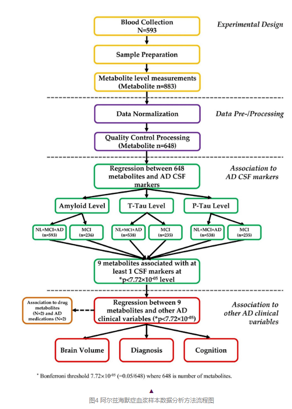 篩選生物標(biāo)志物對(duì)于準(zhǔn)確診斷阿爾茨海默癥患者至關(guān)重要。一個(gè)可靠的生物標(biāo)志物必須顯示出可測(cè)量的變化,協(xié)助區(qū)分健康人和患者。當(dāng)然,最好能在疾病進(jìn)展的輕度認(rèn)知障礙(mild cognitive impairment, MCI)階段就區(qū)分出健康人與阿爾茨海默癥患者。傳統(tǒng)的生物標(biāo)志物發(fā)現(xiàn)通常來(lái)源于蛋白質(zhì)(蛋白質(zhì)組學(xué))或基因(基因組學(xué))研究,而代謝組研究可以揭示患者表型,包括遺傳因素和環(huán)境影響。由于代謝組學(xué)可以測(cè)量特定時(shí)間存在的代謝物,故能揭示患者隨時(shí)間變化的生理狀態(tài)及其對(duì)特定刺激的動(dòng)態(tài)反應(yīng)。