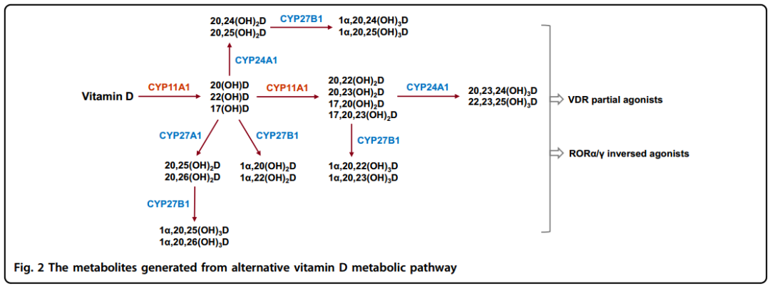 維生素D,傳統(tǒng)上被認(rèn)為是一種必需的脂溶性維生素,可以從膳食獲得,也可以經(jīng)紫外線照射后在皮膚中合成,是固醇激素合成的前體,廣泛調(diào)節(jié)人體的生理過程。維生素D的經(jīng)典代謝路徑是在肝臟和腎臟中經(jīng)歷兩步代謝后生成一種具有生理活性的代謝物骨化三醇,它能夠綁定維生素D受體(VDR)行使多種生理功能,經(jīng)典的角色是調(diào)節(jié)骨重建中的鈣和磷代謝。然而,近期的研究表明它也可以被一種CYP11A1驅(qū)使的非典型代謝路徑代謝和激活。
