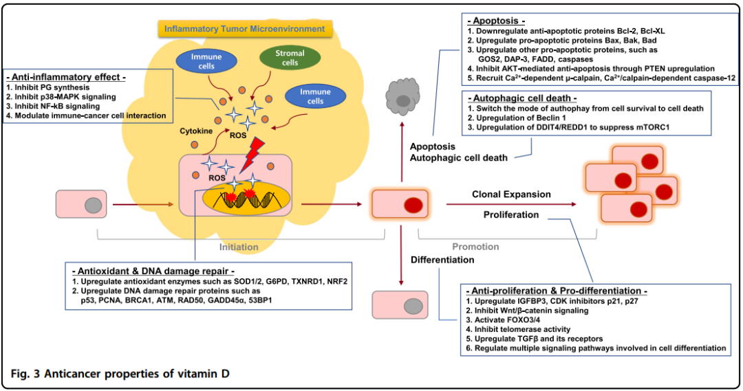 即使細(xì)胞已經(jīng)在初始階段發(fā)生了基因突變,維生素D仍然能通過抑制細(xì)胞增殖、誘導(dǎo)分化和死亡來阻礙腫瘤進(jìn)展進(jìn)而發(fā)揮抗癌作用。