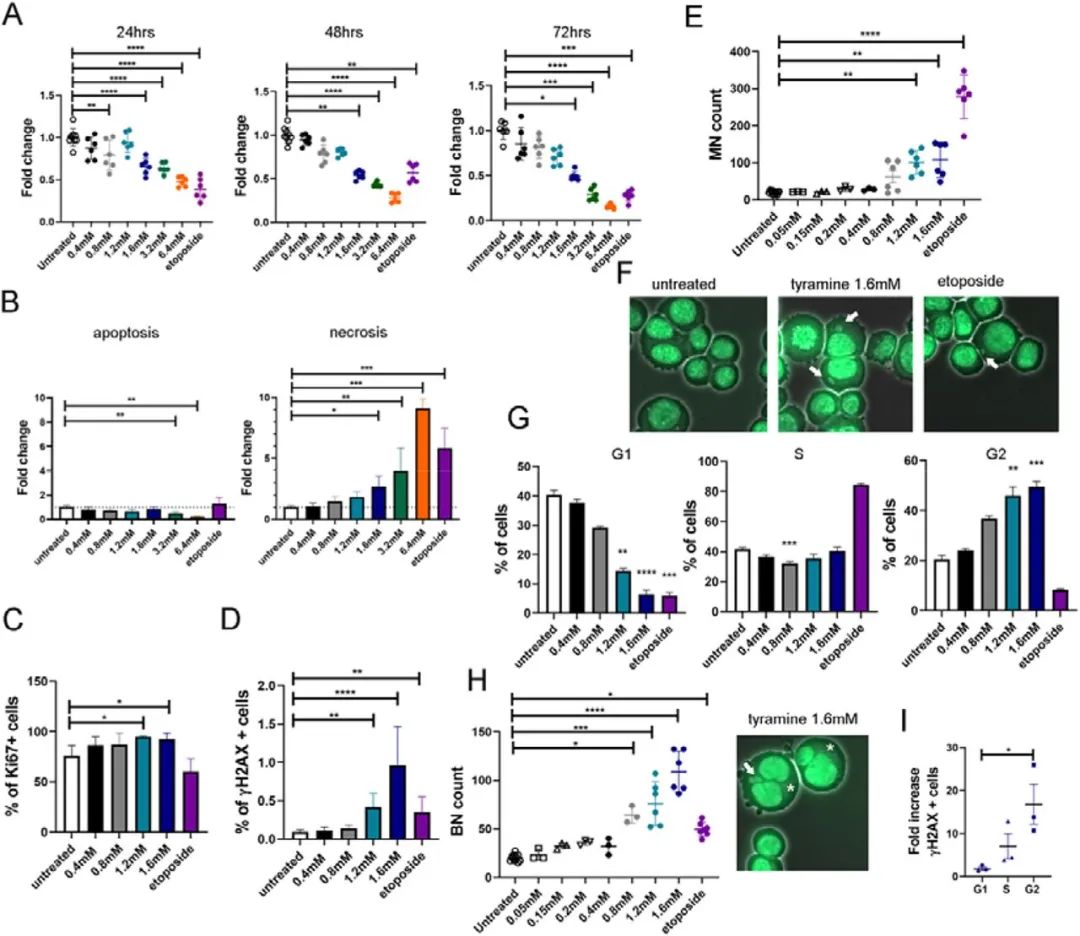 總體而言,作者發(fā)現(xiàn)酪胺會(huì)導(dǎo)致細(xì)胞壞死,促進(jìn)細(xì)胞增殖和DNA損傷,這可能會(huì)破壞基因組的穩(wěn)定性,增加結(jié)腸腫瘤發(fā)生的風(fēng)險(xiǎn)。