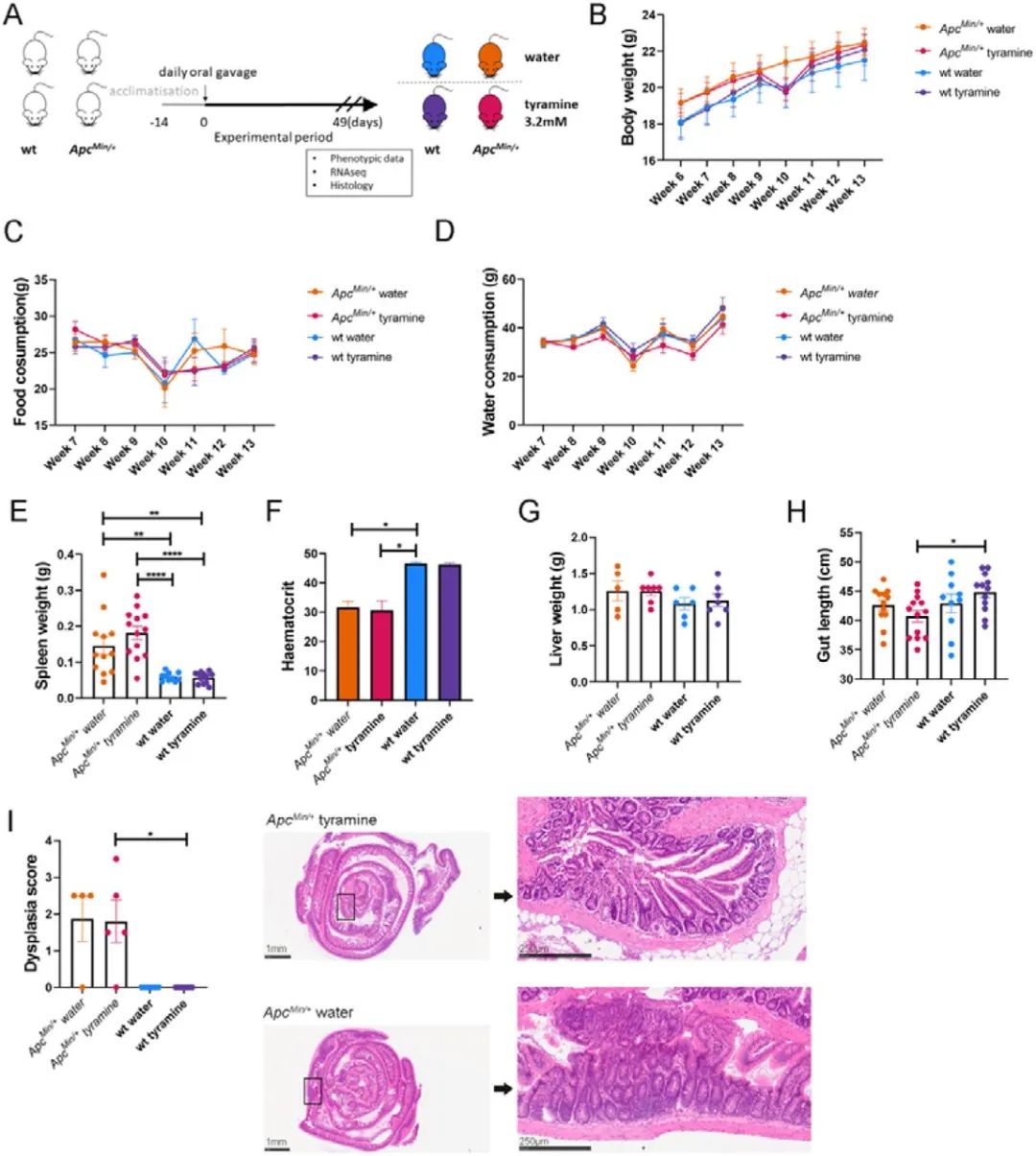 基于以上研究結(jié)果,作者進(jìn)一步在ApcMin/+小鼠體內(nèi)探究酪胺對(duì)CRC發(fā)展的影響(圖3A)。小鼠的體重、食物攝入、飲水在整個(gè)研究的各組間無顯著性差異(圖3B-D)。與野生型對(duì)照組相比,無論給藥方案如何,ApcMin/+小鼠脾臟重量顯著增加,血細(xì)胞比容顯著降低(圖3E-F)。然而,各組間的肝臟重量相當(dāng)(圖3G)。酪胺給藥的小鼠,ApcMin/+小鼠的腸道比WT小鼠腸道更短(圖3H),表明酪胺和小鼠的遺傳菌株之間存在相互作用導(dǎo)致腸道長度的這種表型變化。組織學(xué)分析表明,CRC易感小鼠的不典型增生程度相似,與用藥無關(guān),酪胺給藥不會(huì)導(dǎo)致組織學(xué)變化(圖3I)。