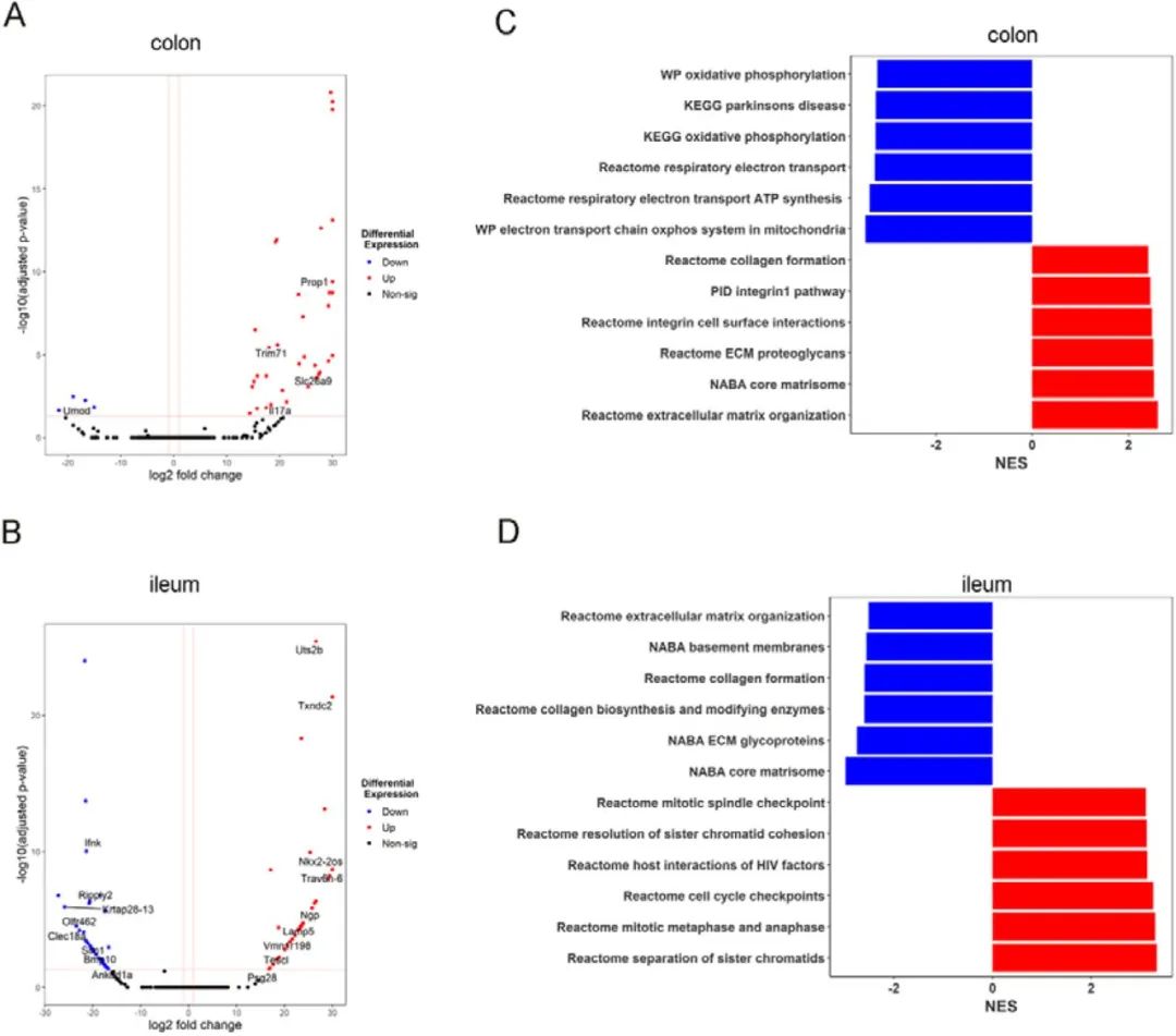 與只經(jīng)過酪胺給藥的 ApcMin/+小鼠相似,與細(xì)胞外基質(zhì)成分相關(guān)通路的基因在酪胺給藥的WT小鼠結(jié)腸中過度表達(dá),然而,從G1期到S期的細(xì)胞周期控制減弱,表明細(xì)胞增殖控制減少;蛋白質(zhì)翻譯與合成途徑的基因在酪胺給藥組回腸中的表達(dá)上調(diào),表明細(xì)胞分裂增加(圖6C-D)。與未給藥的對(duì)照組相比,這些觀察結(jié)果與酪胺給藥的WT小鼠和酪胺處理的HCT116細(xì)胞中更高水平的Ki67+細(xì)胞一致�?偟膩碚f,研究數(shù)據(jù)表明,酪胺驅(qū)動(dòng)健康腸道組織中的炎癥環(huán)境,正如ApcMin/+小鼠中IL-17A和Ngp基因的上調(diào)所證明的那樣,并且在Apc缺陷和野生型環(huán)境中與細(xì)胞增殖增加和上皮屏障受損有關(guān)。