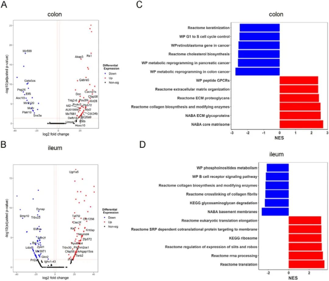 研究發(fā)現(xiàn),與未處理的小鼠相比,酪胺給藥的WT小鼠結(jié)腸中細(xì)胞分裂周期基因(Cdc34b)的表達(dá)顯著上調(diào),同時(shí),結(jié)腸和回腸中與上皮屏障功能相關(guān)的基因包括防御素和C型凝集素(Defb14 和Clec2)的表達(dá)水平升高(圖6A-B)。