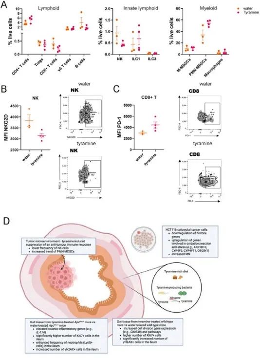 酪胺已被證明可以增加巨噬細(xì)胞中炎癥基因的表達(dá),因此,作者使用流式細(xì)胞術(shù)進(jìn)一步研究回腸和結(jié)腸腫瘤中免疫細(xì)胞亞群的功能。作者在結(jié)腸腫瘤浸潤淋巴細(xì)胞(TIL)中的淋巴、先天淋巴和骨髓細(xì)胞中觀察到相似的頻率,但NK細(xì)胞和多形核骨髓源性抑制細(xì)胞(PMN-MDSC)除外(圖7A)。與水處理的 ApcMin/+小鼠相比,酪胺給藥的NK細(xì)胞頻率較低,這伴隨著腫瘤微環(huán)境NK細(xì)胞中NKG2D的平均熒光強(qiáng)度(MFI)的降低(圖7B),表明酪胺可能會(huì)在腫瘤發(fā)生的早期階段損害有效的抗腫瘤反應(yīng)。此外,抑制標(biāo)記物PD-1的MFI在CD8+ T細(xì)胞中顯示出較高的頻率,但未達(dá)到統(tǒng)計(jì)學(xué)顯著性(圖7C),表明既往細(xì)胞毒性CD8+ T細(xì)胞活化和潛在耗竭。研究結(jié)果表明,酪胺抑制抗腫瘤免疫反應(yīng),促進(jìn)腫瘤發(fā)展。